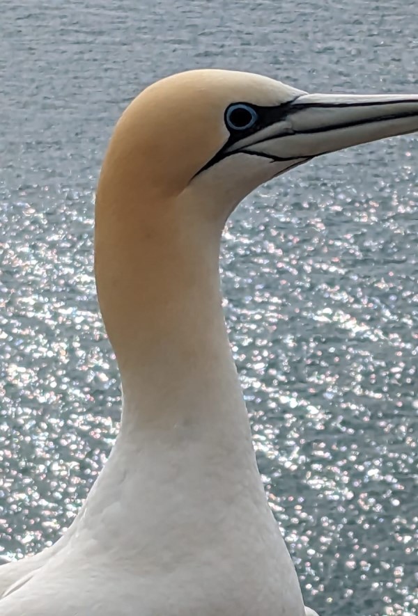 Having looked into that steely blue eye of the Gannet for many years, it is a little odd to see birds with black eyes, or one black and one normal, look back at you. Research is showing that they contracted the virus and have antibodies, which is wonderful. The iris has changed colour but their vison is unaffected. They may have changed eye colour, but I recognise the bolshie aggressive individuals that are back on their territories, which is a joy to see and hear. The decibel levels of previous years have reduced, the air space a little quieter, but with thousands of birds now returned, it is still a magnificent spectacle and really brings home just how fragile and how precious our seabird colonies are.