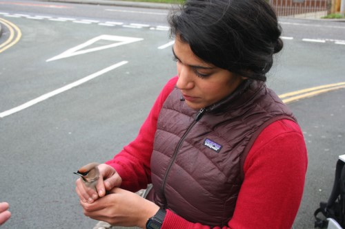 Photographs: Waxwings feeding on mountain ash (Joseph Rock) in a car park; Shenaz Khimji ringing Waxwings during the 2014 irruption; and Waxwings, some showing unmistakable profile with crests up © Shenaz Khimji; Waxwing feeding on apples, East Lothian 2019 © Rosie Filipiak