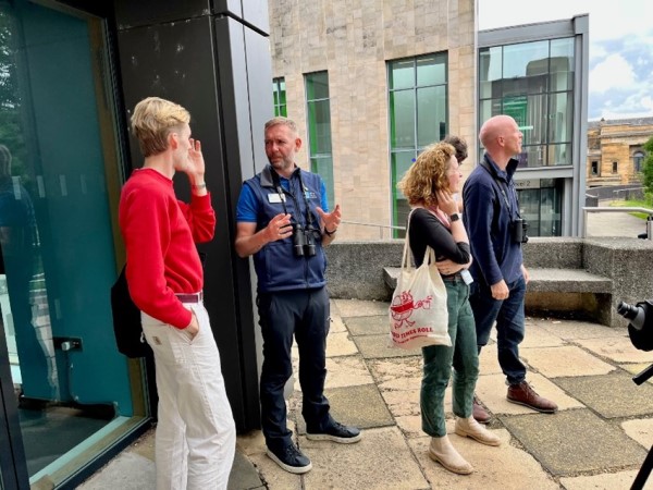 We aim to make the Peregrine Watch events free and accessible to all no matter your age or circumstance. The viewing area is an easy-to-find floorspace suitable for all standards of mobility; toilets are available within the Hunterian Art Gallery next door and there are innumerable cafés and eateries locally. Scopes are provided and guided walks into the university grounds give everyone the chance to see the birds a little closer and allow for photographic opportunities. The sessions are conducted with friendly, informative enthusiasm coupled with a pride in the city of Glasgow.