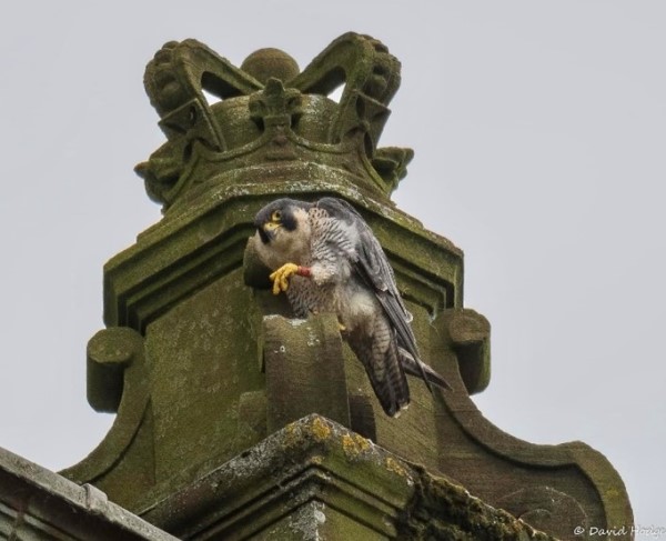 The project builds upon some excellent work by Steven Mcgrath, a Glasgow cabbie with a long-standing interest in the city’s Peregrines and someone who has championed their conservation interests. He has established the history of our colour-ringed female, ‘L7’ (the photo top right shows her leaving the nest, image courtesy of Brian Gallagher). Fledged from a nest on Norwich Cathedral in 2019, she has flown the 380 miles north to Glasgow. Steven maintains contact with the Norwich team and has established a Facebook page with colleague David Hodge called Glasgow University Peregrines to post pictures that support the project aims and objectives.