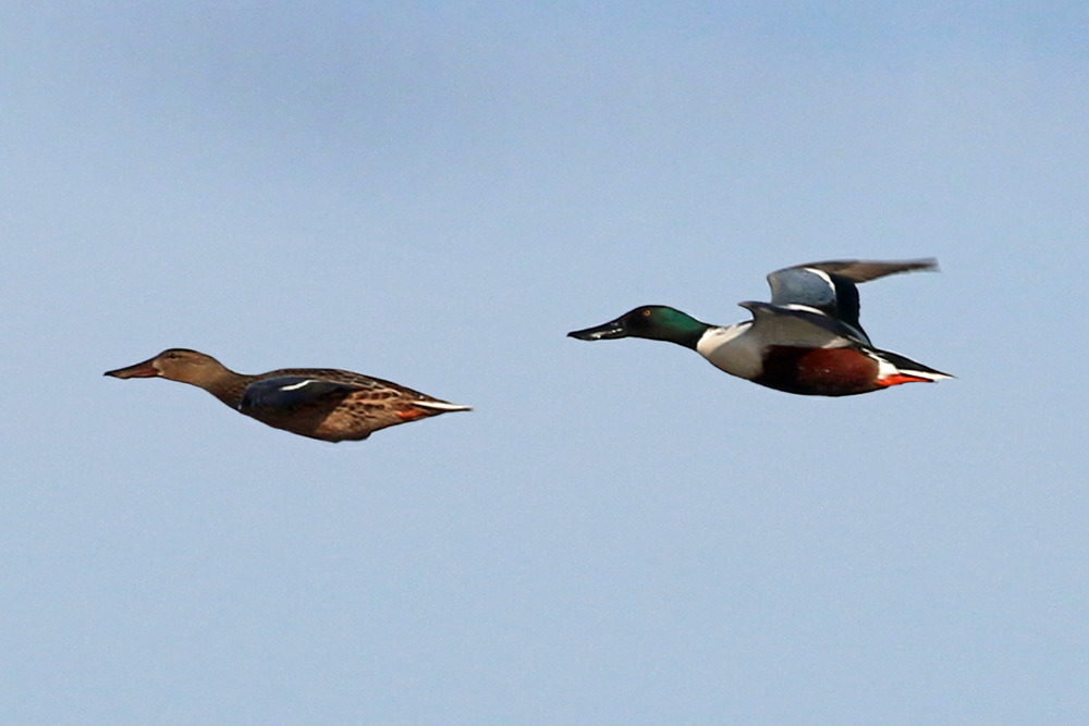 Shoveler pair in flight