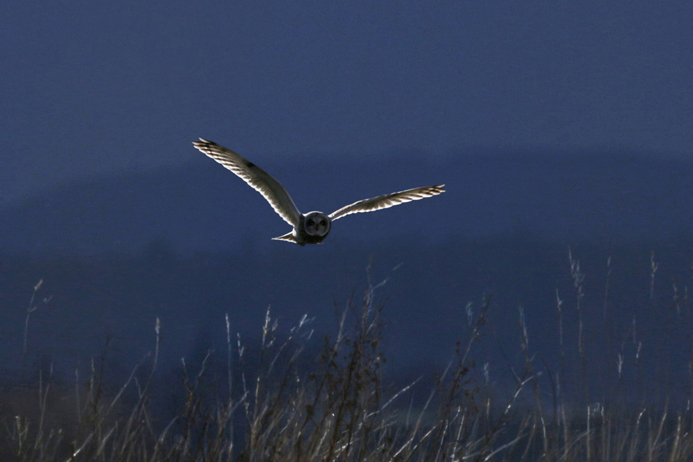 Short Eared Owl ahead of hailstorm, Skinflats