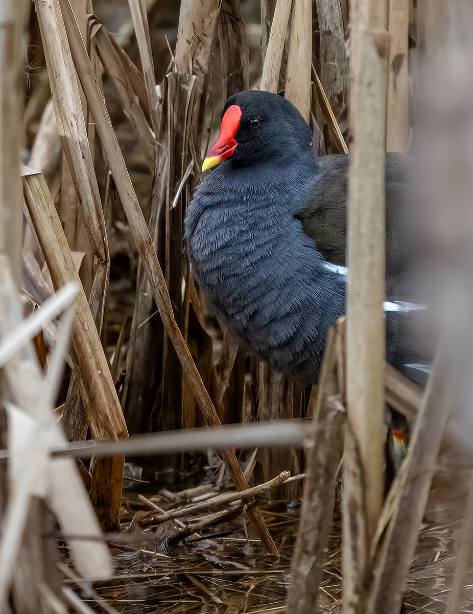 Moorhen building nest in reedbed