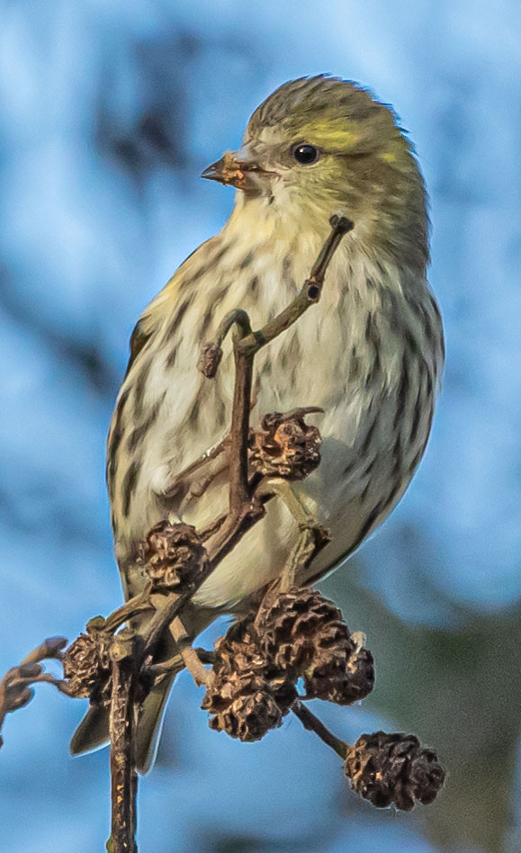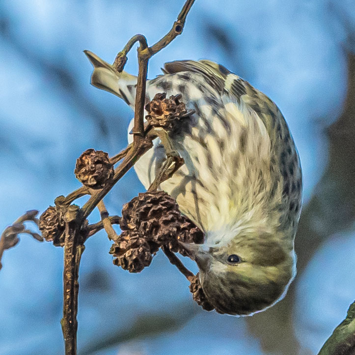 Siskin feeding on alder in winter sunshine