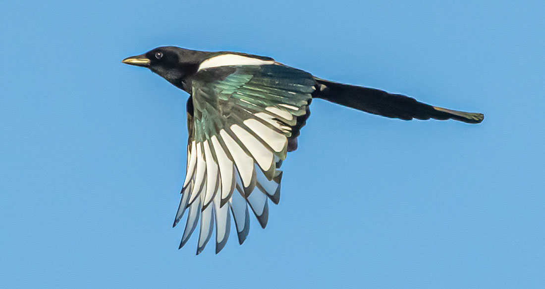 striking plumage on a magpie in flight in bright winter sun
