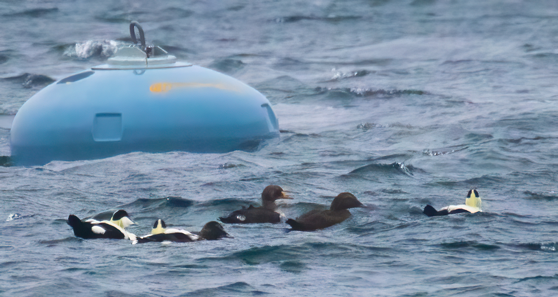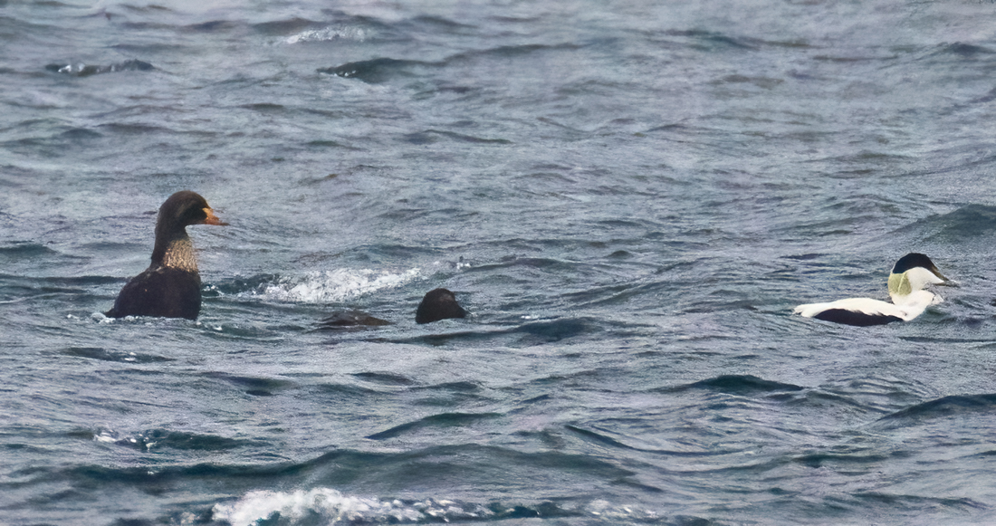King Eider at within a distant Eider flock