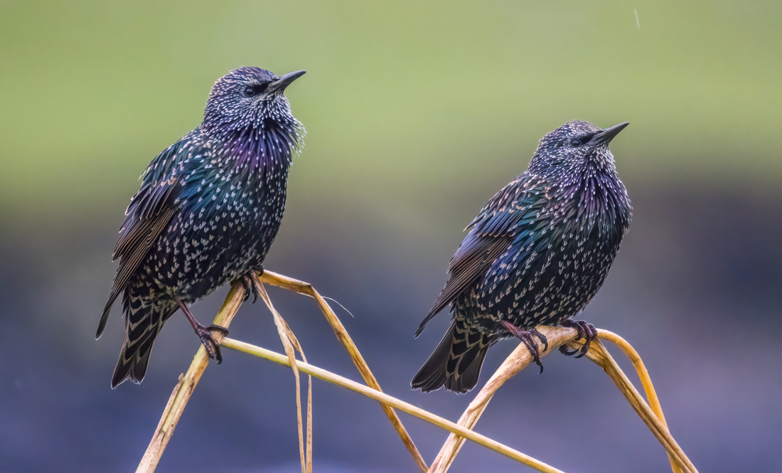 Two Starlings relaxing on reeds at Hoswick