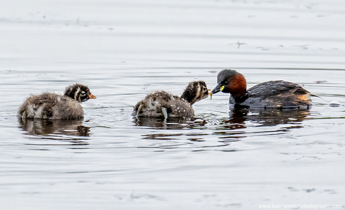 Little Grebe parent feeding fish to youngsters