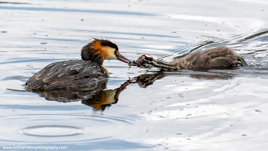 Great Crested Grebe adult feeding youngster