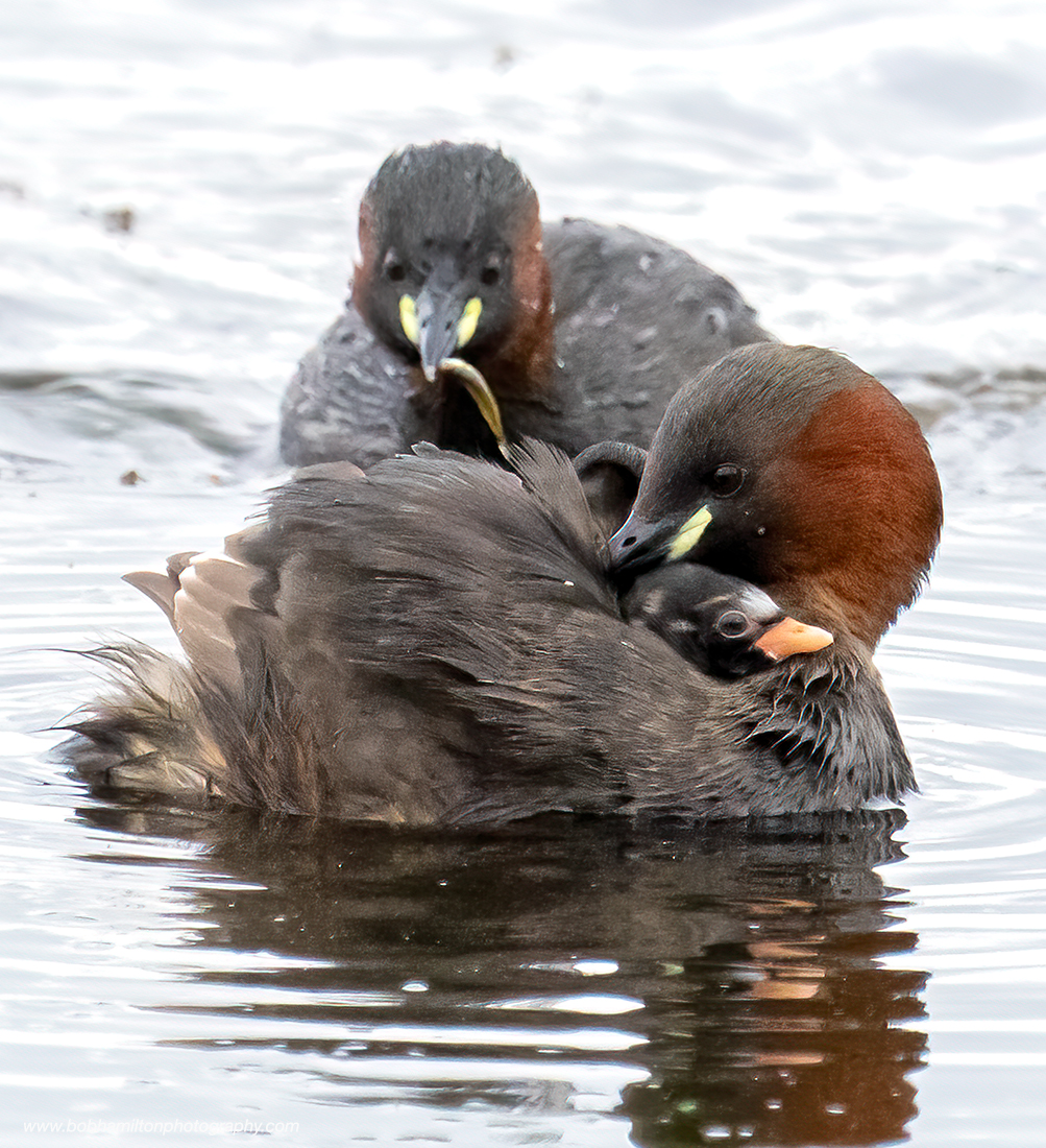 Dabchick adult male bringing fish to youngster on mother's back