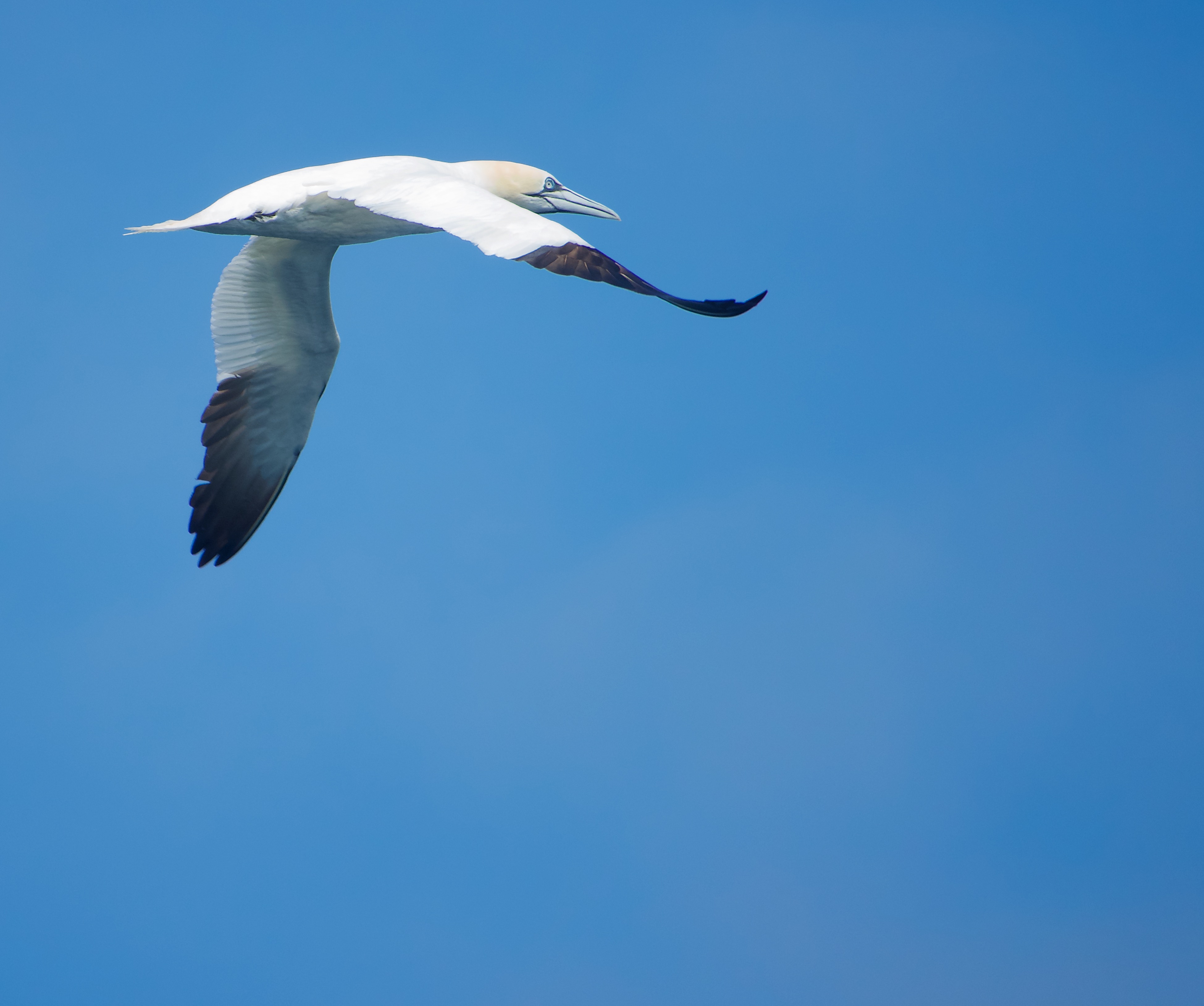 Sunny calm day ideal for a boat trip to the Bass Rock. Caught this passing adult on my Sony Bride RX10 Mark 3 (settings ISO 400, 220mm, f/4, 1/2500). I deepened the colour a tad in the phot app and cropped the image to position the gannet in the corner so its flying into the blue.