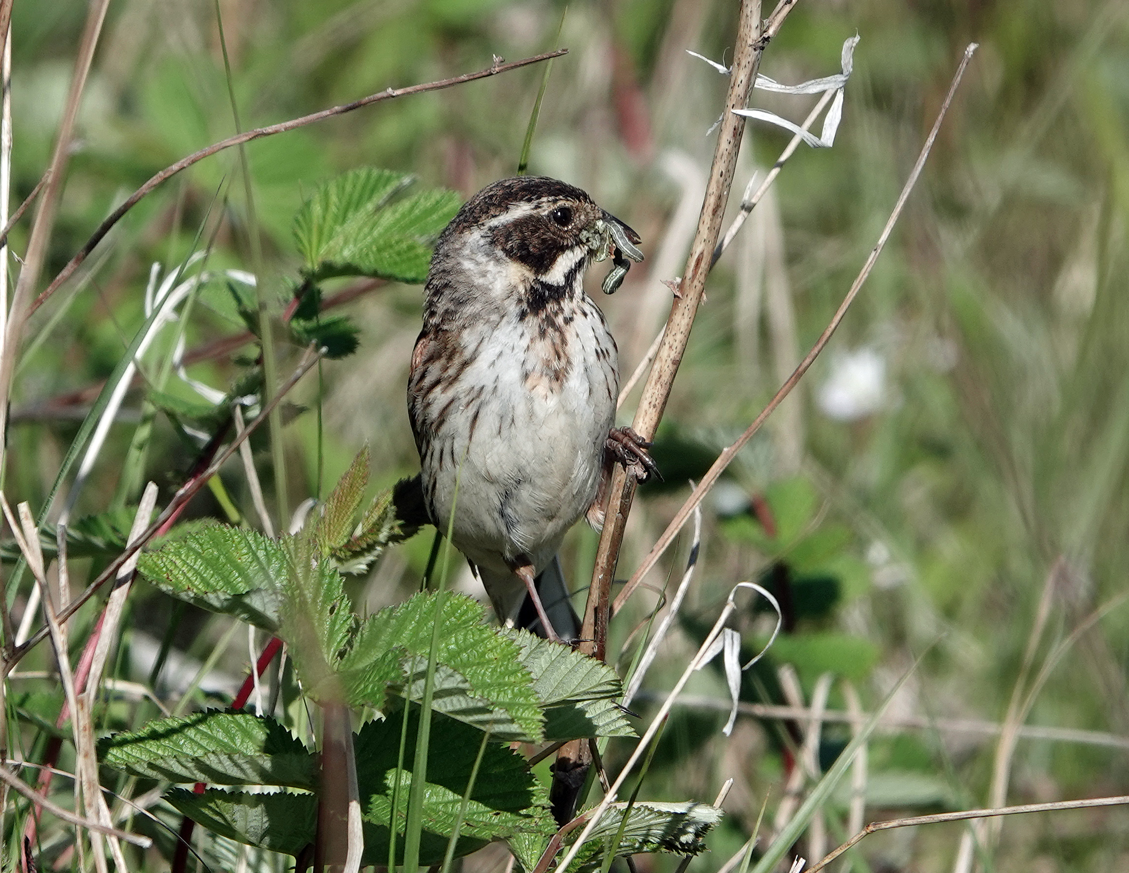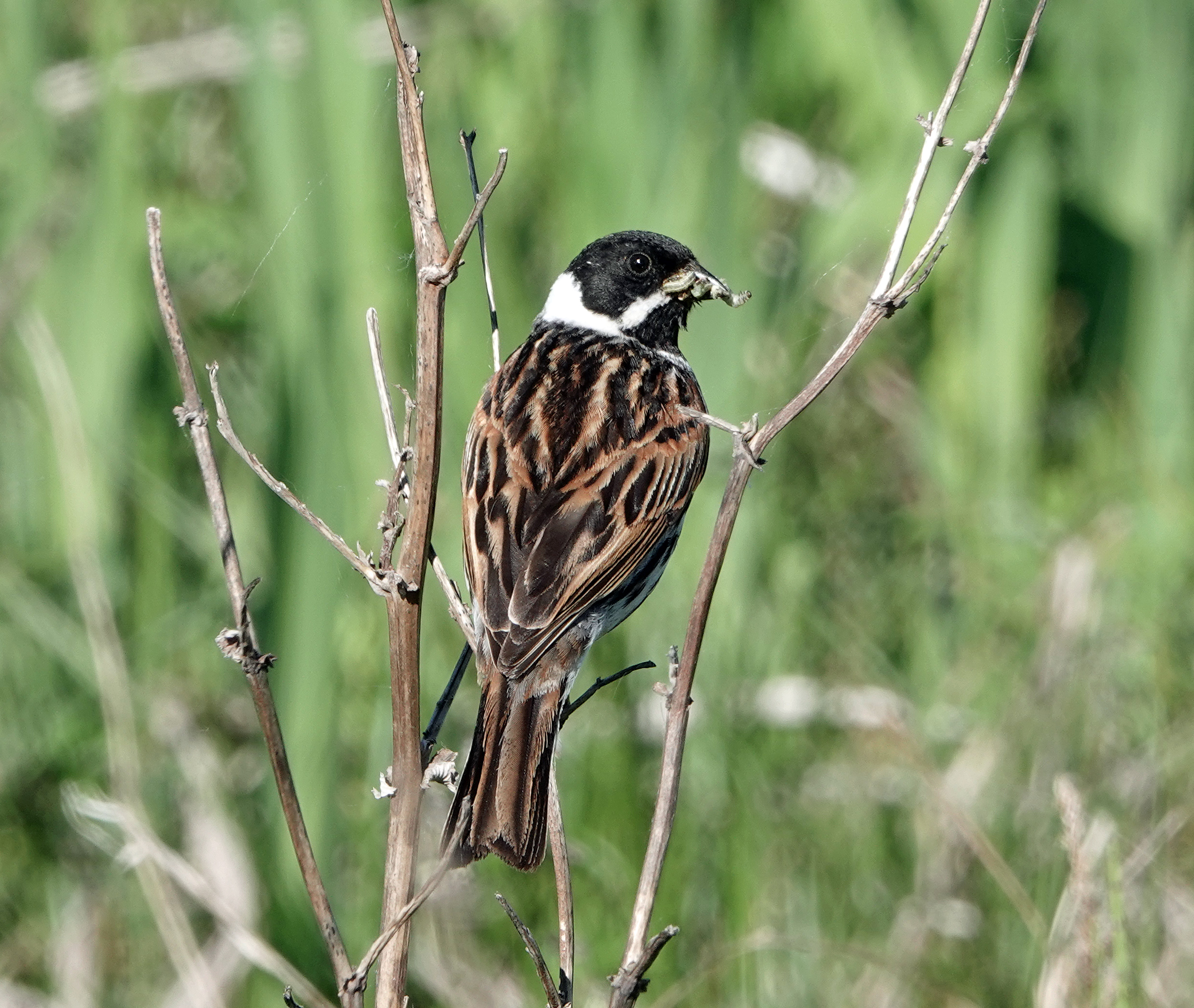 Common Reed Bunting male carrying food