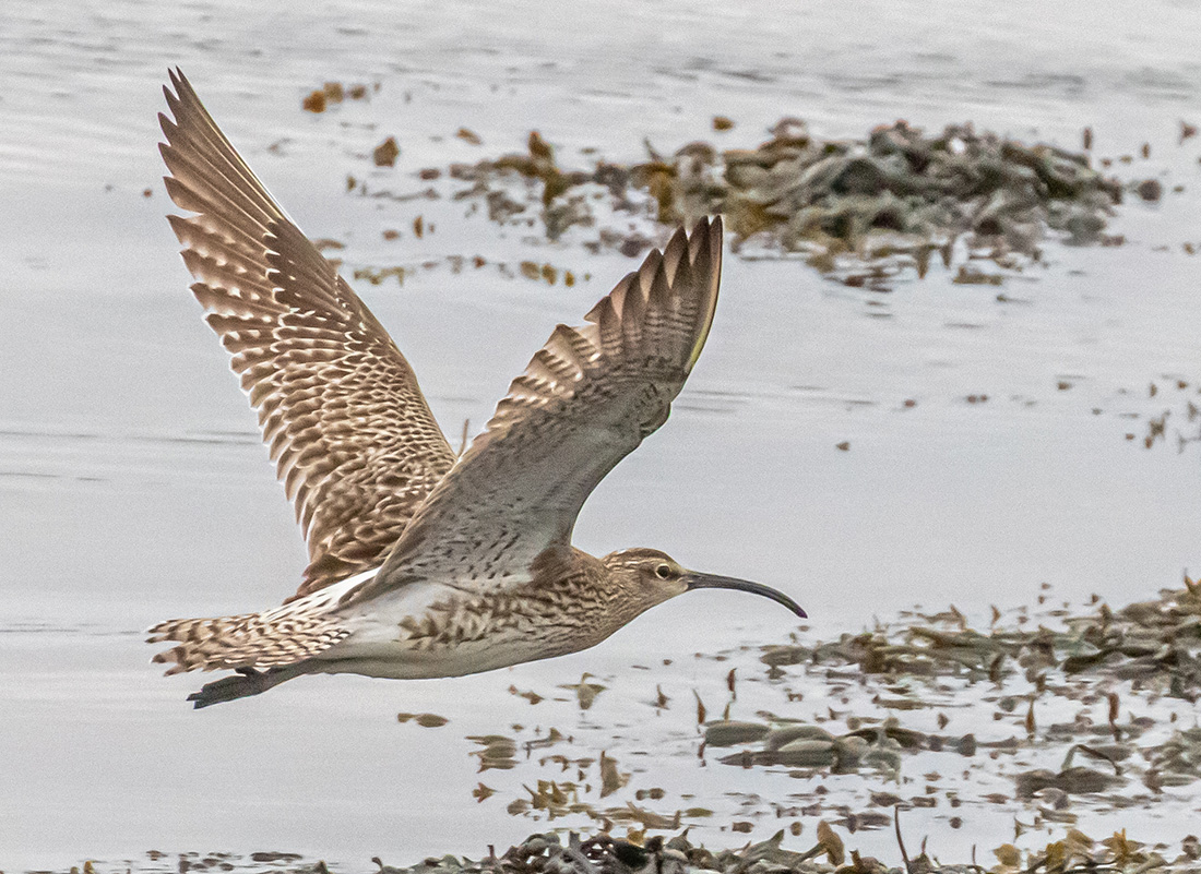 A Whimbrel in flight (among many curlews at Ardmore)