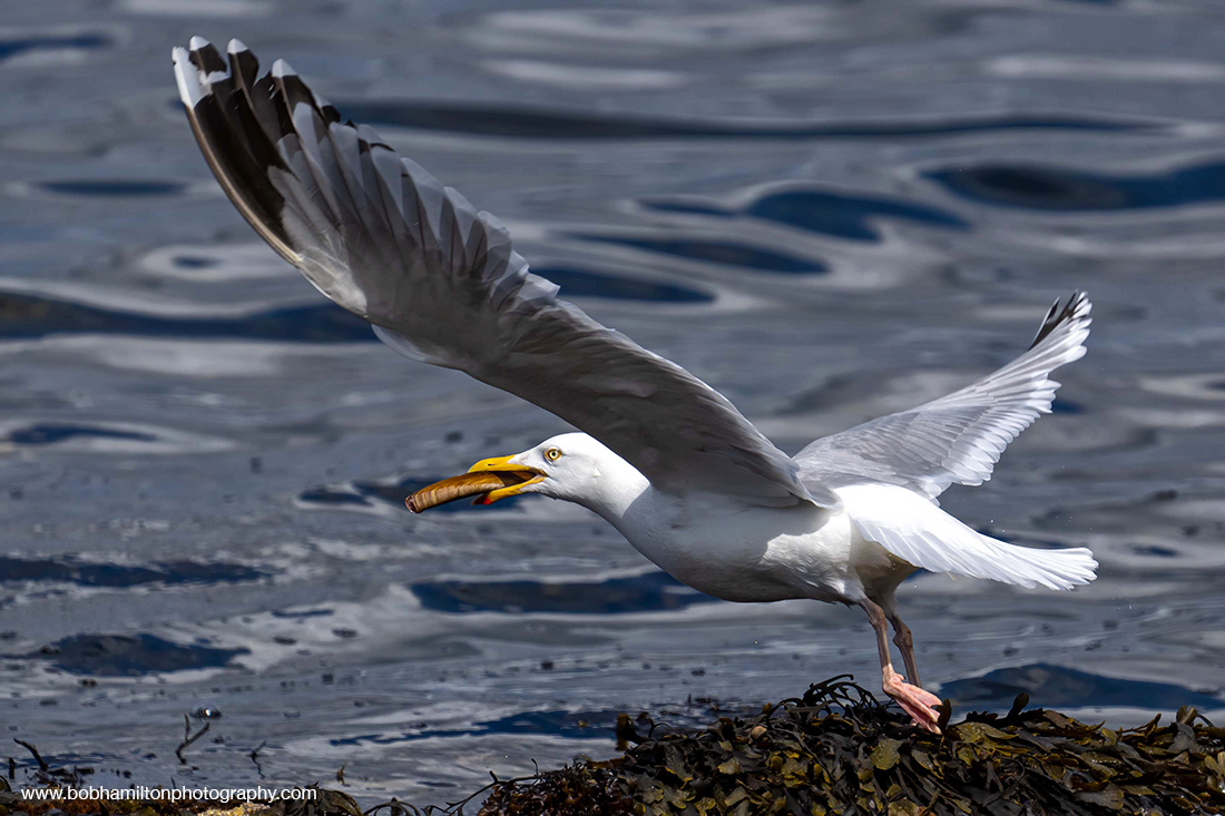 Herring Gull in flight with Razor Clam in Beak