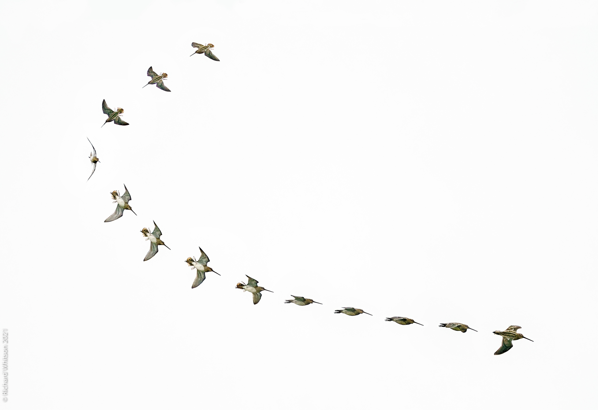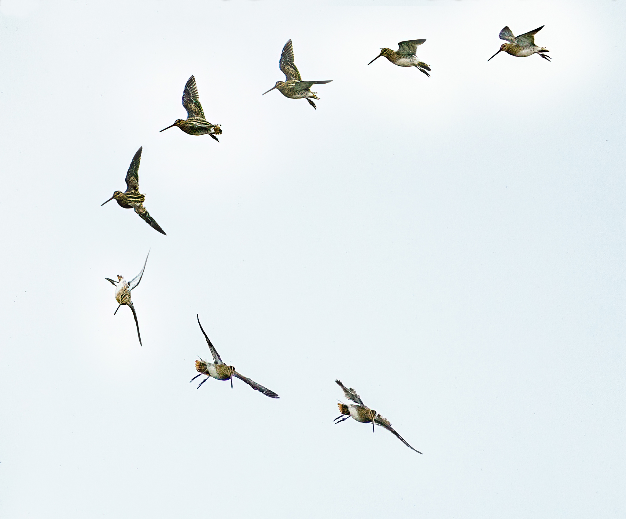 Power dive of Common Snipe with its splayed tail feathers that produce the drumming.