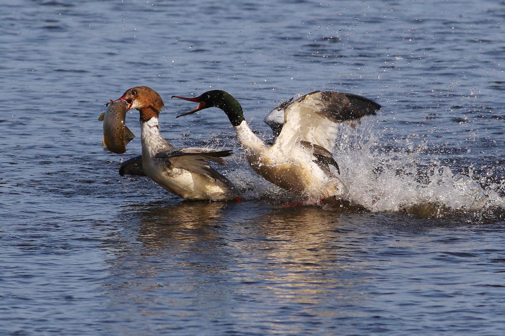 Goosanders chasing and fighting over a large Brown Trout