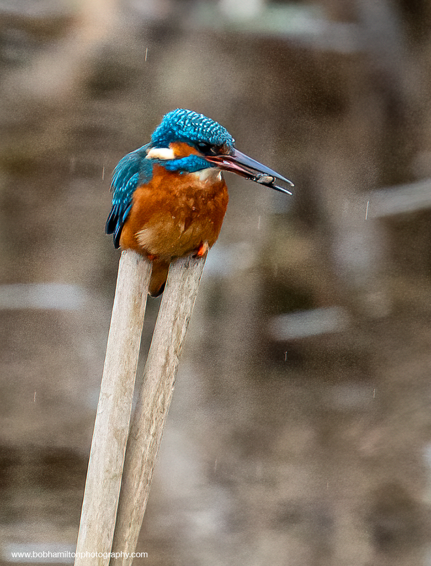 Male Kingfisher with Catch Perched on Reed