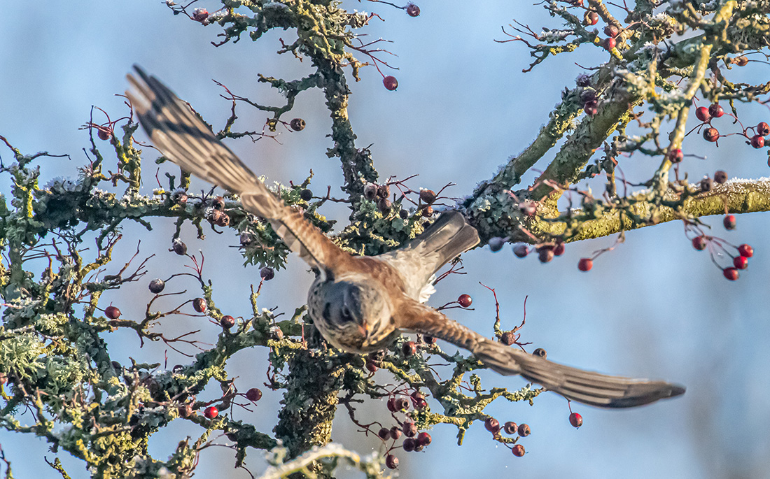 Fieldfare flying from a berry-bearing tree