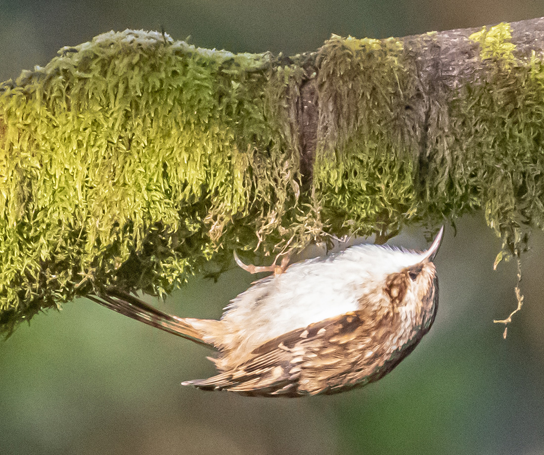 Treecreeper foraging upside down in moss