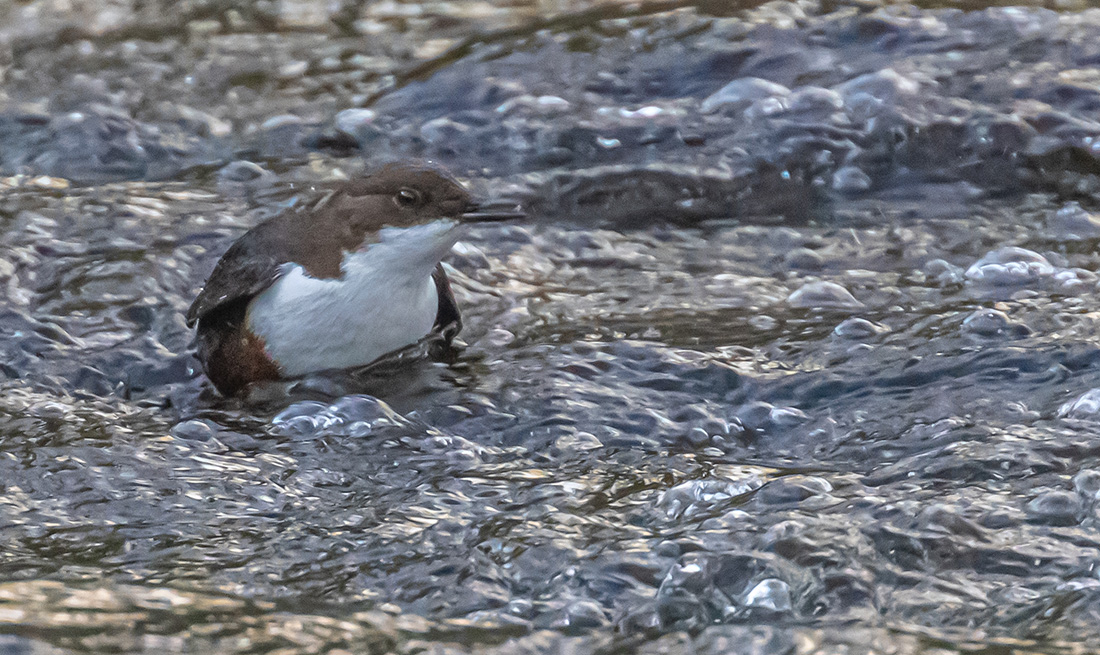 Dipper re-emerging from turbulent water