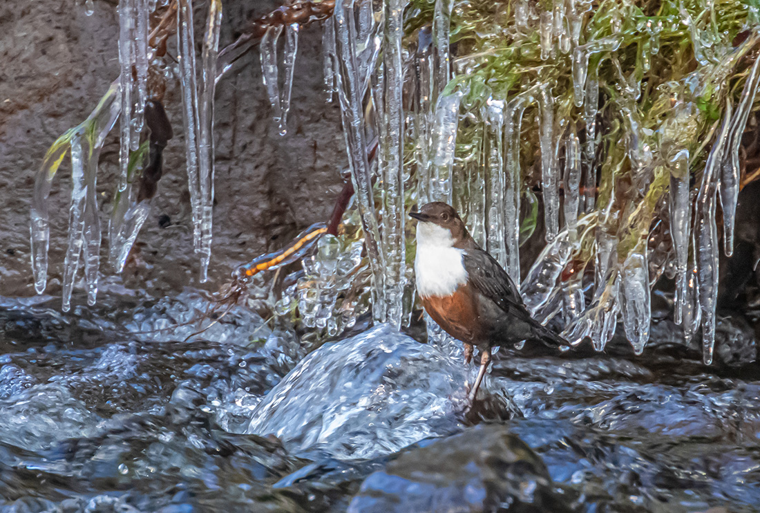 Dipper on the Blane Water with a background of icicles