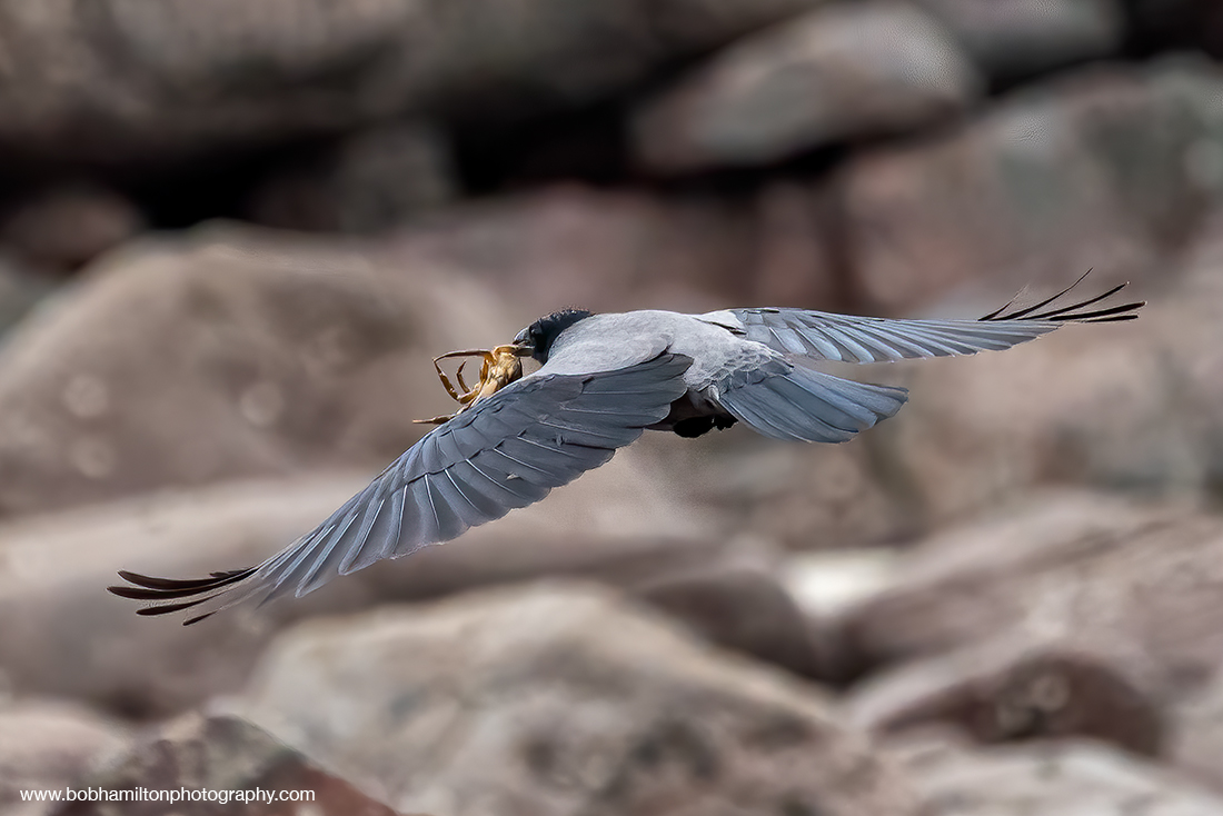 Hooded Crow in Flight with Crab in Beak