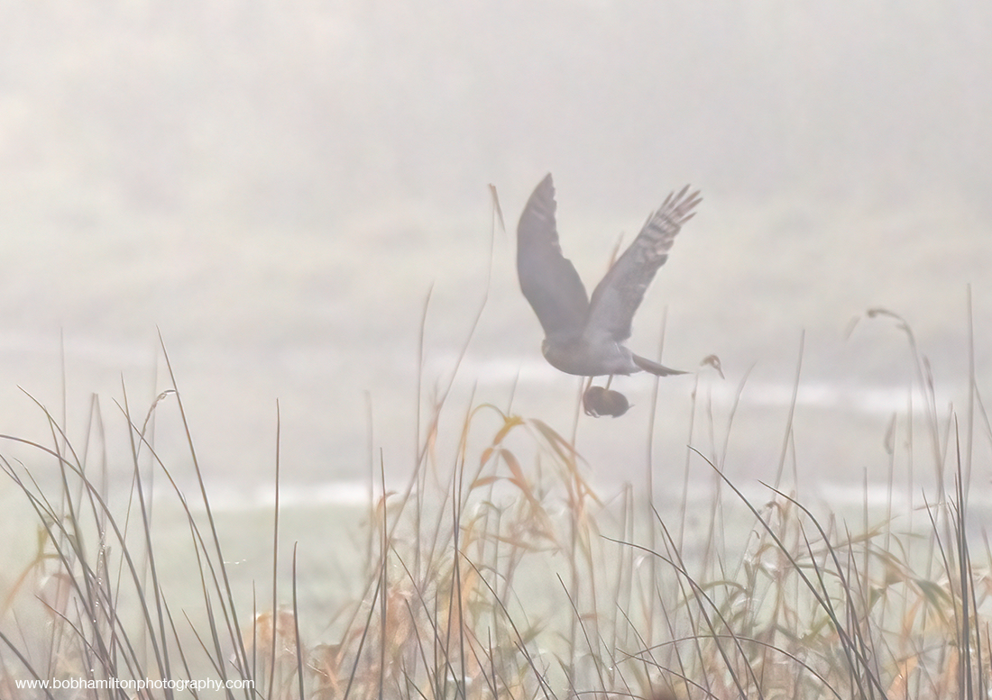 Hen Sparrowhawk Clutching Vole Prey in Early Morning Mist
