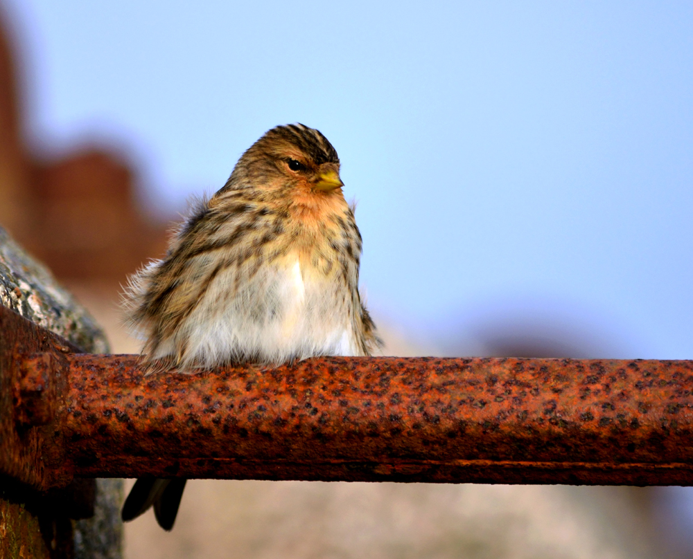 Twite preening after bathing.