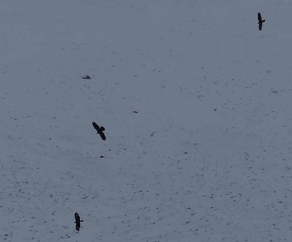 - distant record shot of two mature and one immature (2nd calendar year) Golden Eagles.