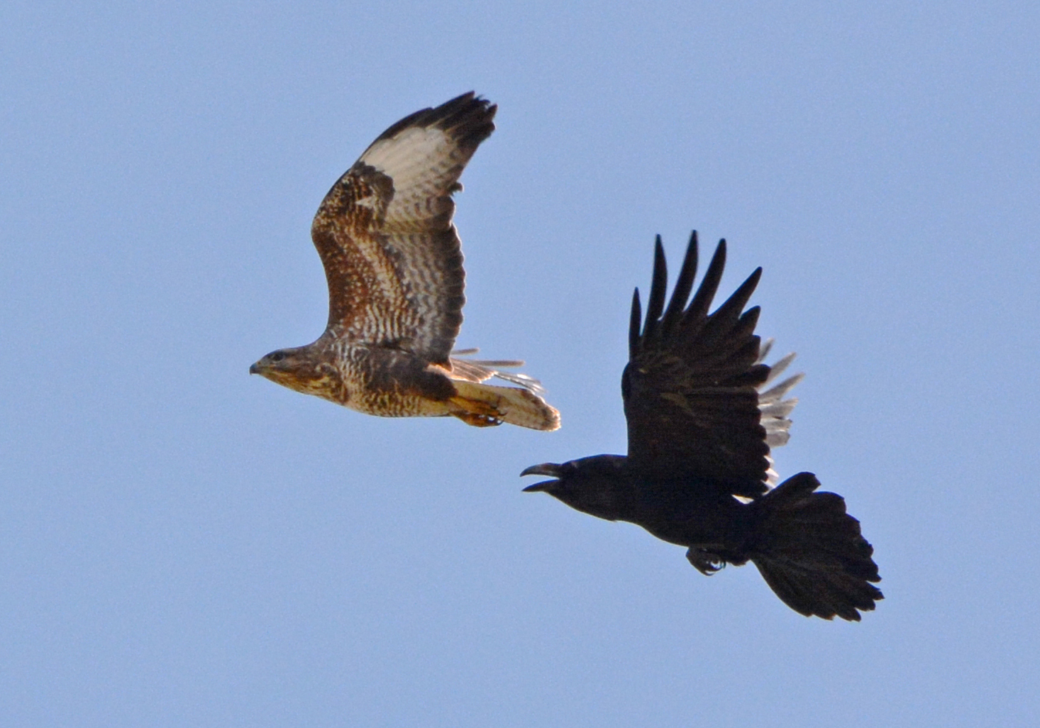 Raven mobbing Common Buzzard at Loch Doon