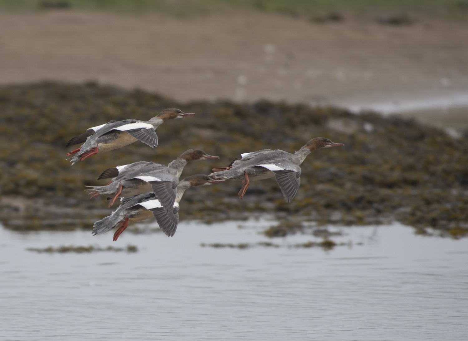 - Goosanders coming in to land on the River Lossie