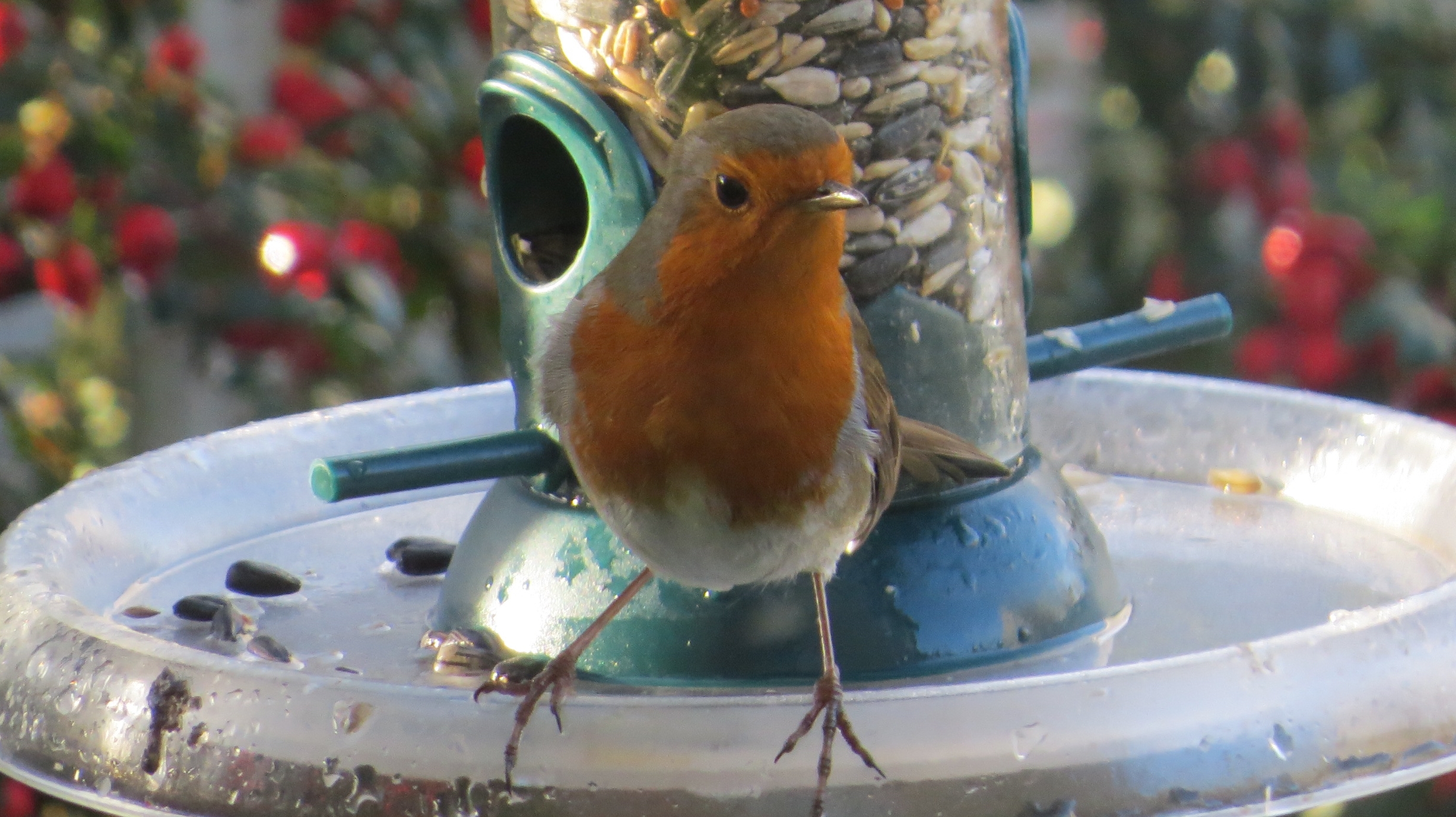 Robin at feeder in garden