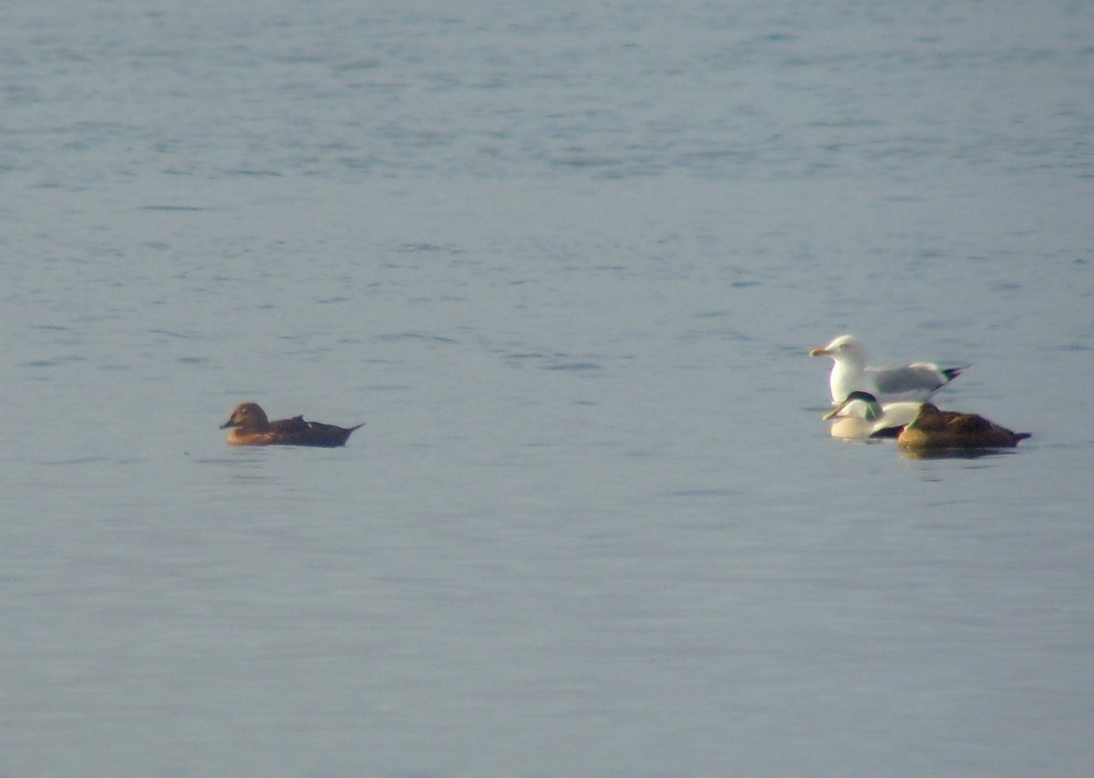 - Fife. Female (left) off shore with small group of Common Eiders...