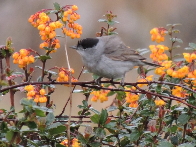 - Highland. One of several Blackcaps of both sexes feeding on the flowers in a Berberis hedge in my garden.
